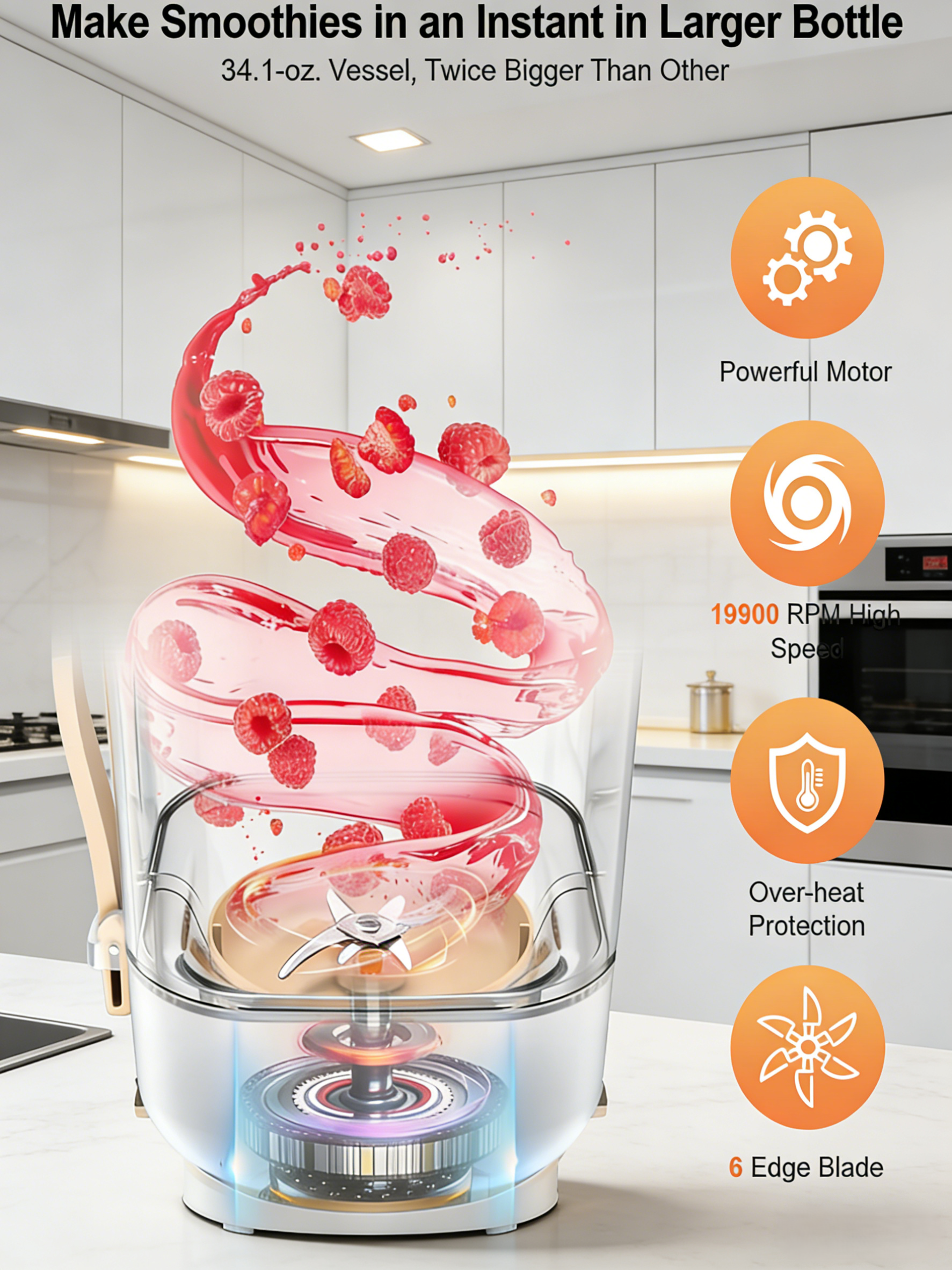 - Powerful Blending: 19900RPM motor + 6-edge blade for quick, smooth mixes.